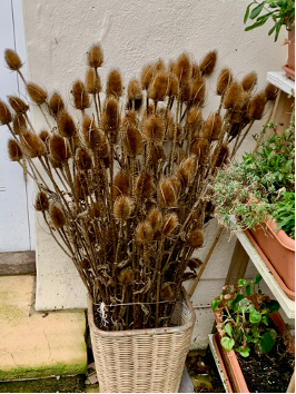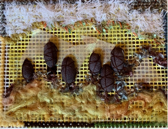 In this instance, I started by sponging the paint in different shades onto the canvas. The teasel seed heads are represented by silk worm cocoons, painted and tied onto the work. This is supplemented by silk tops sewn into the canvas and extra fibres and stitched wool. Given time, I would work an additional layer onto the piece to give more blurred edges.