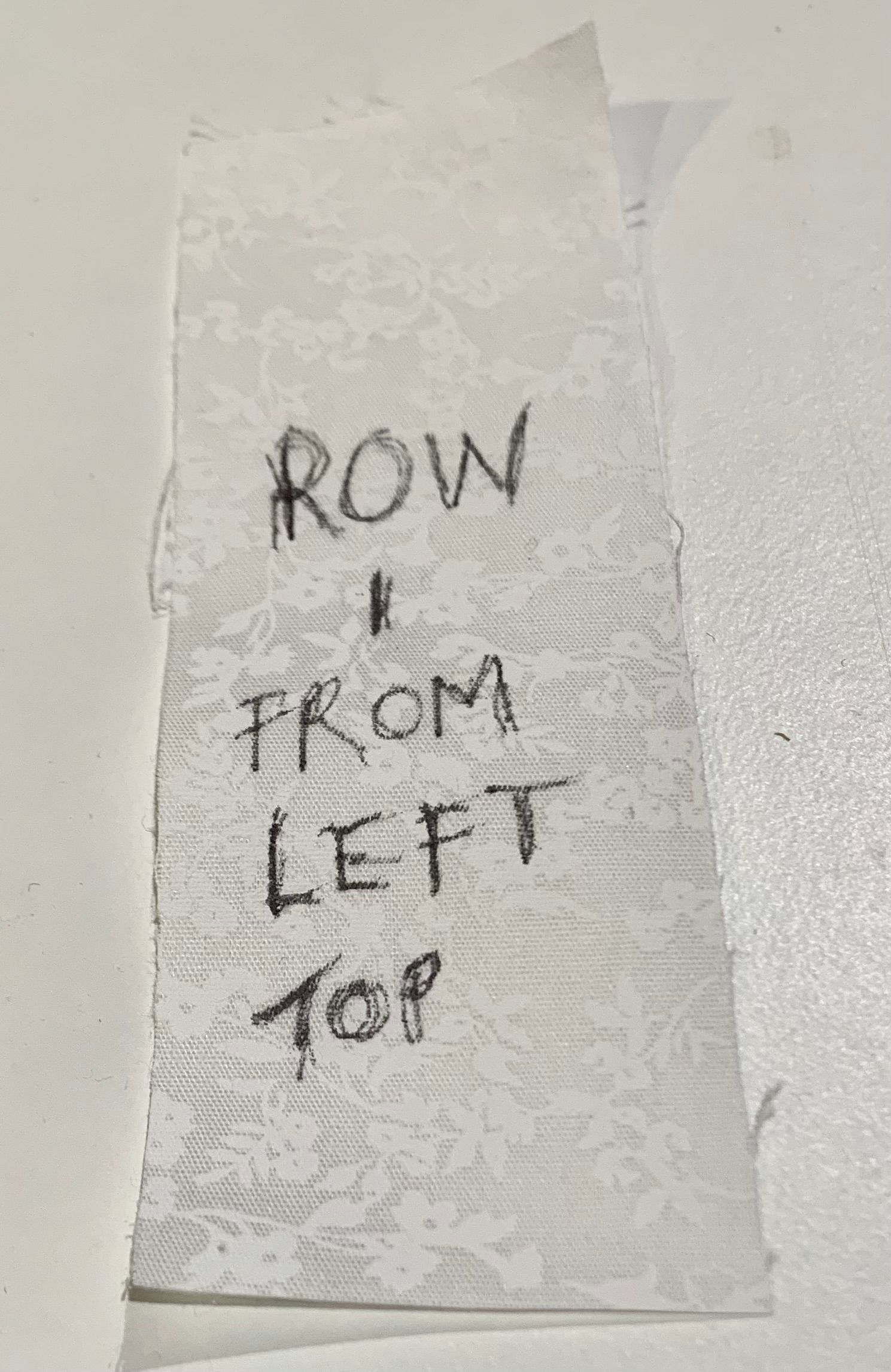 d) Label all row of the quilt: (this one was a QAYG - (quilt as you go technique)) - again I do this using post-it notes and pins or small strips of waste fabric on which you write the position of the row with a Frixion (an air erasable) pen. I had done this, but in working the free motion quilting a couple of these had fallen off and it caused me no end of problems getting the rows back in order.
